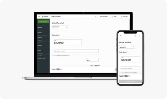 Don’t have a Clover® device or away from it and don’t want to miss a sale? Clover Virtual Terminal gives you the flexibility and convenience of processing payments – and, refunds – wherever you happen to be. Log into your Clover Web Dashboard from a smartphone, tablet, or computer and you’re ready for business anytime, anywhere.